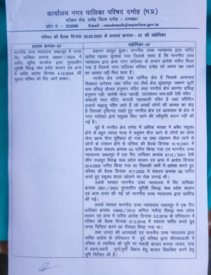 दमोह। नगर पालिका अध्यक्ष श्रीमती मंजू वीरेंद्र राय एवं जिला कांग्रेस कमेटी के अध्यक्ष रत्नचंद जैन द्वारा आयोजित पत्रकार वार्ता में समस्त पाषर्दगढ़ एवं जिला कांग्रेस कमेटी के पदाधिकारी ने वार्ता को संबोधित करते हुए बिल्कुल स्पष्ट रूप से कहा की दमोह एक धार्मिक आस्था की नगरी है जिसमें सभी संप्रदाय के लोग निवास करते हैं एवं सनातन धर्म के लोगों की आस्था शुरू से ही गोवंश वध के विरुद्ध रही है ऐसी स्थिति में दिनांक 25 फरवरी 2025 को आयोजित परिषद की बैठक का यही उद्देश्य था की समस्त परिषद को परिषद का प्रस्ताव क्रमांक 7 पढ़कर सुनाया जाए और सभी पार्षदों की सहमति दी जाए कि स्लॉटर हाउस नहीं खुलेगा नहीं खुलेगा किंतु भाजपा के पार्षद गणों ने जानबूझकर बैठक में हो हल्ला मचाकर बैठक को निरस्त करवा दिया पुनः 27 फरवरी को आयोजित बैठक मैं भी संकल्प क्रमांक 7 को ही सभी पार्षदों की सहमति से स्लॉटरहाउस के विरोध में हस्ताक्षर करके संकल्प पत्र की प्रति हाई कोर्ट जबलपुर भेजी जानी थी किंतु भाजपा द्वारा दमोह की जनता को भ्रमित करने के उद्देश्य से एवं धार्मिक द्वेष फैलाने की दृष्टि से यह पूरा षड्यंत्र रचा गया और कलेक्टर के माध्यम से बैठक स्थगित करवा दी इस अवसर पर नगर पालिका अध्यक्ष श्रीमती मंजू राय ने स्पष्ट रूप से पत्रकार वार्ता में कहा कि मैं और मेरी परिषद किसी भी सूरत में दमोह एवं आसपास के धार्मिक क्षेत्र में स्लॉटर हाउस खोलने की अपनी सहमति कभी नहीं दे सकती जिला कांग्रेस कमेटी के अध्यक्ष रत्नचंद जैन ने दमोह की जनता को आश्वस्त करते हुए कहा कि हम सभी सनातन धर्म के लोग ना तो कभी गोवंश वध के पक्ष में रहे हैं और ना ही स्लॉटर हाउस जैसी परमिशन को नगर पालिका के माध्यम से देने के पक्ष में है उन्होंने स्पष्ट कहा कि भाजपा और कांग्रेस के पार्षद गण एकमत होकर यदि प्रस्ताव के पक्ष में अपने हस्ताक्षर करके उसकी प्रति हाई कोर्ट को भेज देते तो निश्चित रूप से इस अनिश्चित पर पूर्ण विराम लग जाता किंतु जानबूझकर शहर के अन्य मुद्दों से ध्यान भटकने एवं कांग्रेस शासित परिषद की छवि को धूमिल करने को उद्देश्य कतिपय नेताओं द्वारा षड्यंत्र रचा गया उसकी जिला कांग्रेस कमेटी निंदा करती है और हम शहर के विकास के लिए कृत संकल्पित है अध्यक्ष प्रतिनिधि शिवम राय ने इस अवसर पर पत्रकारों को संबोधित करते हुए कहा कि अध्यक्ष का प्रतिनिधि होने के नाते जब मैं स्पष्ट रूप से अपनी बात परिषद में रखता हूं तो तो बीजेपी के पार्षद प्रतिनिधि बोलने से रोकते हैं जबकि वे लोग प्रतिनिधि के रूप में अपनी बात रख सकते हैं यह दोहरा व्यवहार क्यों किया जा रहा है मेरा स्पष्ट रूप से कहना है की दमोह के बुद्धिजीवि जन नगर पालिका के प्रस्ताव को ध्यानपूर्वक पढ़ें एवं भाजपा द्व