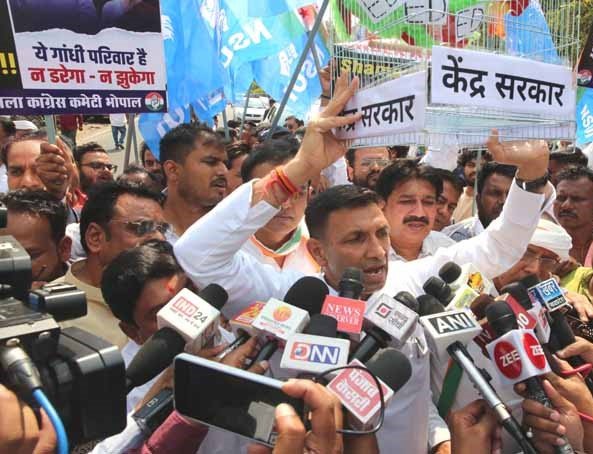 प्रदेश कांग्रेस अध्यक्ष जीतू पटवारी के नेतृत्व में बुधवार को भोपाल जिला शहर कांग्रेस कमेटी के अध्यक्ष प्रवीण सक्सेना और ग्रामीण अध्यक्ष अनोखी मानसिंह पटेल के तत्वावधान में ईडी द्वारा नेशनल हेराल्ड मामले पर चार्ज शीट दायर किये जाने पर मोदी सरकार की तानाशाही, भाजपा सरकार के खिलाफ विरोध प्रदर्शन कर भाजपा की कुत्सित मानसिकता के खिलाफ विरोध दर्ज कराया गया। विरोध प्रदर्शन में बड़ी संख्या में कांग्रेसजनों ने हाथों में तखतियां लेकर ईडी और प्रधानमंत्री नरेन्द्र मोदी के खिलाफ जमकर नारेबाजी की।