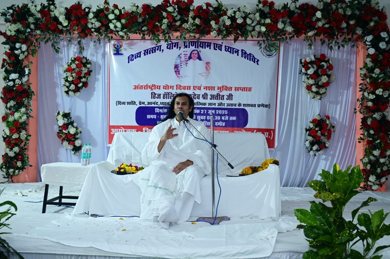 दमोह । म.प्र. राज्य विधिक सेवा प्राधिकरण जबलपुर द्वारा वर्ष 2025-26 में दिये गये निर्देशानुसार प्रधान जिला न्यायाधीश एवं जिला विधिक सेवा प्राधिकरण अध्यक्ष पी.सी.गुप्ता के कुशल मार्गदर्शन में योग दिवस एवं नशा मुक्ति अभियान का साप्ताहिक शिविर नवीन जिला न्यायालय परिसर दमोह में संपन्न हुआ। 21 जून से 27 जून तक सात दिवसीय योग, ध्यान एवं प्राणायाम शिविर में दिव्य शांति, प्रेम, आनंद, ध्यान, भक्ति, आध्यात्मिक ज्ञान और उत्सव के शाश्वत प्रणेता हिज हॉलिनेस गुरूदेव श्री अतीत जी ने प्रतिभागियों को योग, ध्यान व प्राणायाम के साथ श्वास के प्रवाह पर नियंत्रण व सुदर्शन क्रिया का अभ्यास कराया गया। शिविर में न्यायाधीशगण, अधिवक्तागण, प्रशासनिक अधिकारीगण तथा न्यायालयीन स्टॉफ ने प्रशिक्षण प्राप्त किया।