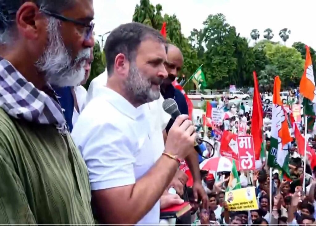 इस विरोध प्रदर्शन में शामिल होने कांग्रेस नेता राहुल गांधी भी दिल्ली से पटना पहुंचे और यहां विरोध रैली में शामिल हुए। उनके साथ बिहार के पूर्व उपमुख्यमंत्री और राजद नेता तेजस्वी यादव और वीआईपी प्रमुख मुकेश सहनी भी शामिल हुए। इनकम टैक्स चौराहे से राहुल गांधी, तेजस्वी और दीपांकर भट्टाचार्य एक गाड़ी पर सवार होकर प्रदर्शन करते चुनाव आयोग के ऑफिस के लिए निकले। लेकिन पुलिस ने सभी नेताओं को सचिवालय थाने के पास बैरिकेडिंग कर रोक दिया। उन्हें यहां से आगे जाने की परमिशन नहीं दी गई। यहीं से कार्यकर्ताओं को संबोधित करने के बाद सभी नेता लौट गए। यहां से चुनाव आयोग का ऑफिस करीब 150 मीटर दूर था।