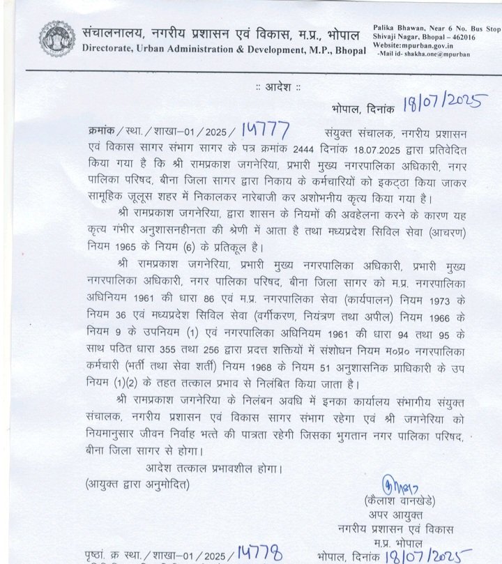 प्रभारी सीएमओ जगनेरिया द्वारा शासन के नियमों की अवहेलना करने के कारण गंभीर अनुशासनहीनता की श्रेणी में आता है तथा मध्य प्रदेश सिविल सेवा (आचरण) नियम 1965 के नियम (6) के प्रतिकूल है । श्री राम प्रकाश जगनेरिया प्रभारी मुख्य नगर पालिका अधिकारी नगर पालिका परिषद बीना जिला सागर को मध्य प्रदेश नगर पालिका अधिनियम 1961 की धारा 86 एवं मध्य प्रदेश नगर पालिका सेवा (कार्यपालन) नियम 1973 के नियम 36 एवं मध्य प्रदेश सिविल सेवा (वर्गीकरण , नियंत्रण तथा अपील) नियम 1966 के नियम 9 के उप नियम (1) एवं नगर पालिका अधिनियम 1961 की धारा 94 तथा 95 के साथ पठित धारा 355 तथा 256 द्वारा प्रदत्त शक्तियों में संशोधन नियम मध्य प्रदेश नगर पालिका कर्मचारी (भर्ती तथा सेवा भर्ती ) नियम 1968 के नियम 51 अनुशासनिक प्राधिकारी के उप नियम (1)(2) के तहत तत्काल प्रभाव से निलंबित किया जाता है । निलंबन अवधि में उनका कार्यालय संभागीय संयुक्त संचालक नगरीय प्रशासन एवं विकास सागर संभाग सागर रहेगा और निलंबन अवधि में नियमानुसार जीवन निर्वाह भत्ते की पात्रता होगी इसका भुगतान नगर पालिका परिषद बीना जिला सागर से होगा । उक्त आदेश अपर आयुक्त नगरीय प्रशासन एवं विकास कैलाश वानखेड़े के हस्ताक्षर से जारी किया गया है ।