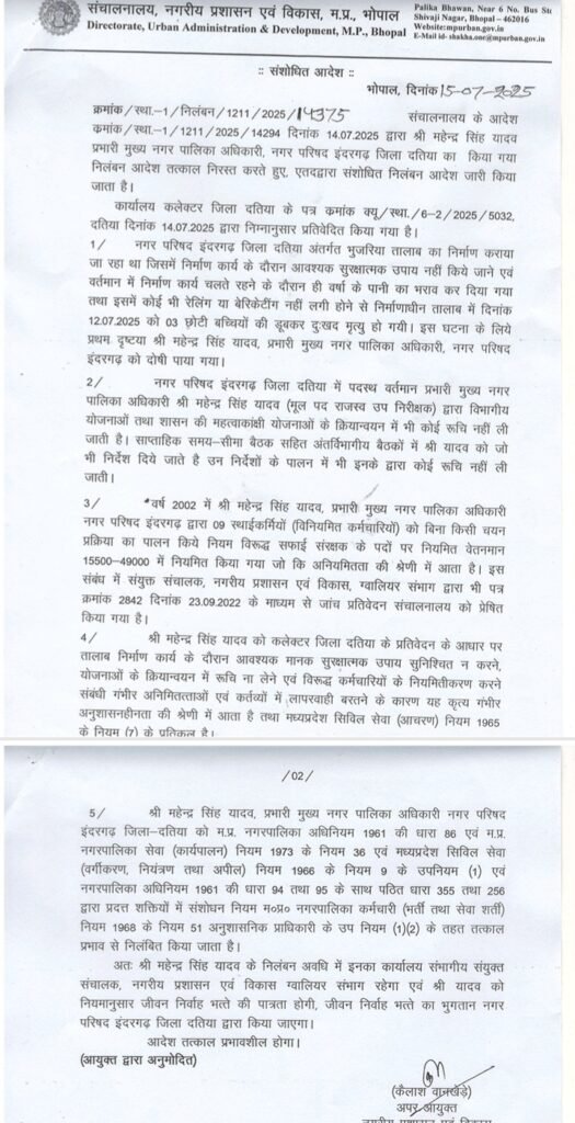 संचालनालय नगरीय प्रशासन एवं विकास भोपाल द्वारा जारी संशोधित आदेश क्रमांक स्था. /1211/2025 14375 दिनांक 14/07/2025 द्वारा श्री महेंद्र सिंह यादव प्रभारी मुख्य नगर पालिका अधिकारी नगर परिषद इंदरगढ़ जिला दतिया का किया गया पूर्व का निलंबन आदेश निरस्त कर संशोधित निलंबन आदेश 15 जुलाई को पुनः जारी किया गया है जिसमें कहा गया है कि कार्यालय कलेक्टर जिला दतिया के पत्र क्रमांक क्यू /स्था. / 6 _ 2 / 2025 /5032 दतिया दिनांक 14/07.2025 द्वारा निम्न अनुसार प्रतिवेदन किया गया है कि नगर परिषद इंदरगढ़ जिला दतिया अंतर्गत भुजरिया तालाब का निर्माण कराया जा रहा था जिसमें निर्माण कार्य के दौरान आवश्यक सुरक्षात्मक उपाय नहीं किए जाने एवं वर्तमान में निर्माण कार्य के चलते रहने के दौरान ही वर्षा के पानी का भराव कर दिया गया तथा इसमें कोई भी रेलिंग या वेरीकेटिंग नहीं लगी होने से निर्माणाधीन तालाब में दिनांक 12/07/2025 को तीन छोटी बच्चियों की डूब कर दुखद मृत्यु हो गई थी इस घटना के लिए प्रथम दृष्टया श्री महेंद्र सिंह यादव प्रभारी मुख्य नगर पालिका अधिकारी नगर परिषद इंदरगढ़ को दोषी पाया गया है।