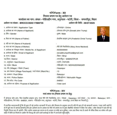 यह आवेदन 29 जुलाई 2025 को ऑनलाइन माध्यम से आवेदन संख्या BRCCO/2025/17989735 के तहत प्राप्त हुआ था। आवेदन में नाम डोनाल्ड जॉन ट्रंप, पता ग्राम हसनपुर, वार्ड संख्या 13, पोस्ट बाकरपुर, थाना मोहिउद्दीननगर, जिला समस्तीपुर दर्ज किया गया था। जांच में पाया गया कि आवेदन पत्र में लगी फोटो, आधार संख्या, बारकोड और पते से संबंधित जानकारियों में जानबूझकर छेड़छाड़ की गई थी। यह बात संज्ञान में आते ही राजस्व अधिकारी द्वारा आवेदन को अस्वीकृत कर दिया गया। मोहिउद्दीननगर के सीओ ने कहा कि यह हरकत जानबूझकर मजाक उड़ाने और सिस्टम को बदनाम करने के इरादे से की गई है। यह कृत्य आईटी एक्ट का उल्लंघन है और इसकी शिकायत स्थानीय साइबर थाना पुलिस से की गई है। दोषियों के खिलाफ सख्त कानूनी कार्रवाई की जाएगी।