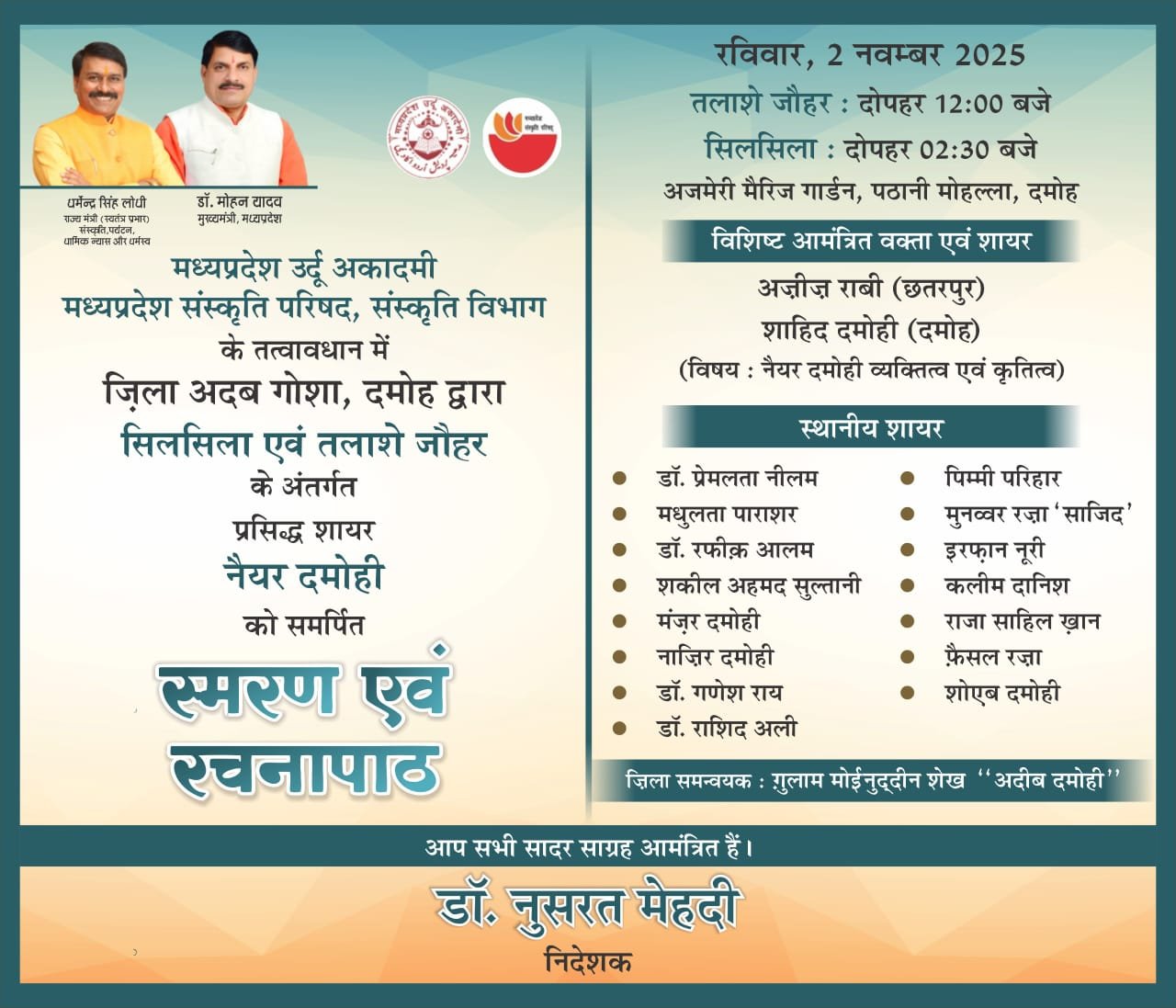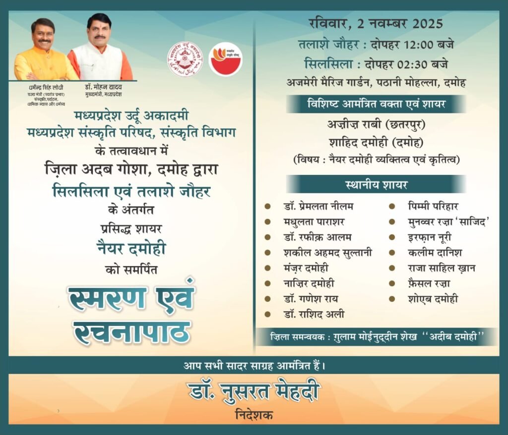 दमोह ! मध्य प्रदेश उर्दू अकादमी, संस्कृति परिषद, संस्कृति विभाग के तत्त्वावधान में ज़िला अदब गोशा दमोह के द्वारा सिलसिला एवं तलाशे जौहर के तहत प्रसिद्ध शायर नैयर दमोह को समर्पित स्मरण एवं रचनापाठ का आयोजन रविवार 2 नवम्बर 2025 को दोपहर 12:00 बजे से अजमेरी मैरिज गार्डन, दमोह में ज़िला समन्वयक अदीब दमोही के सहयोग से किया जाएगा।