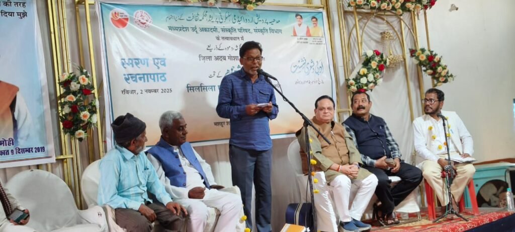 दमोह ! मध्य प्रदेश उर्दू अकादमी, संस्कृति परिषद, संस्कृति विभाग के तत्त्वावधान में ज़िला अदब गोशा, दमोह के द्वारा सिलसिला एवं तलाशे जौहर के तहत दमोह के सुप्रसिद्घ अंतरराष्ट्रीय शायर नैयर दमोही को समर्पित स्मरण एवं रचना पाठ का आयोजन 2 नवम्बर 2025 को अजमेरी मैरिज गार्डन, दमोह में ज़िला समन्वयक ग़ुलाम मुईनुद्दीन शेख़ ‘अदीब दमोही’ के सहयोग से किया गया।