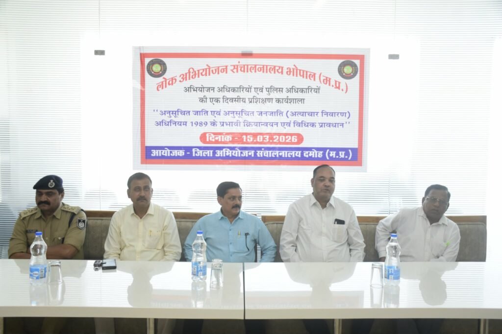 दमोह। संचालक, लोक अभियोजन संचालनालय, भोपाल के निर्देशानुसार तथा श्री धर्मेंद्र सिंह तारन, प्रभारी उपनिदेशक अभियोजन के मार्गदर्शन में जिला अभियोजन परिवार, दमोह द्वारा दिनांक *15 मार्च 2026* को “अनुसूचित जाति एवं अनुसूचित जनजाति (अत्याचार निवारण) अधिनियम, 1989 के प्रभावी क्रियान्वयन एवं विधिक प्रावधान” विषय पर एक दिवसीय कार्यशाला का सफलतापूर्वक आयोजन किया गया। कार्यक्रम में माननीय चतुर्थ अतिरिक्त जिला एवं सत्र न्यायाधीश श्री जितेंद्र नारायण सिंह, नगर पुलिस अधीक्षक श्री एच. आर. पांडे, अध्यक्ष जिला अधिवक्ता संघ श्री कमलेश भारद्वाज, सेवानिवृत्त उपसंचालक अभियोजन श्री नरेंद्र सिंह उईके, सेवानिवृत्त जिला लोक अभियोजन अधिकारी श्री बी एम शर्मा, अतिरिक्त डीपीओ श्री कैलाश चंद पटेल, लोक अभियोजक श्री मुकेश जैन, वरिष्ठ एडीपीओ श्री के के गौतम, श्री मनोज कुमार की गरिमामयी उपस्थिति रही।