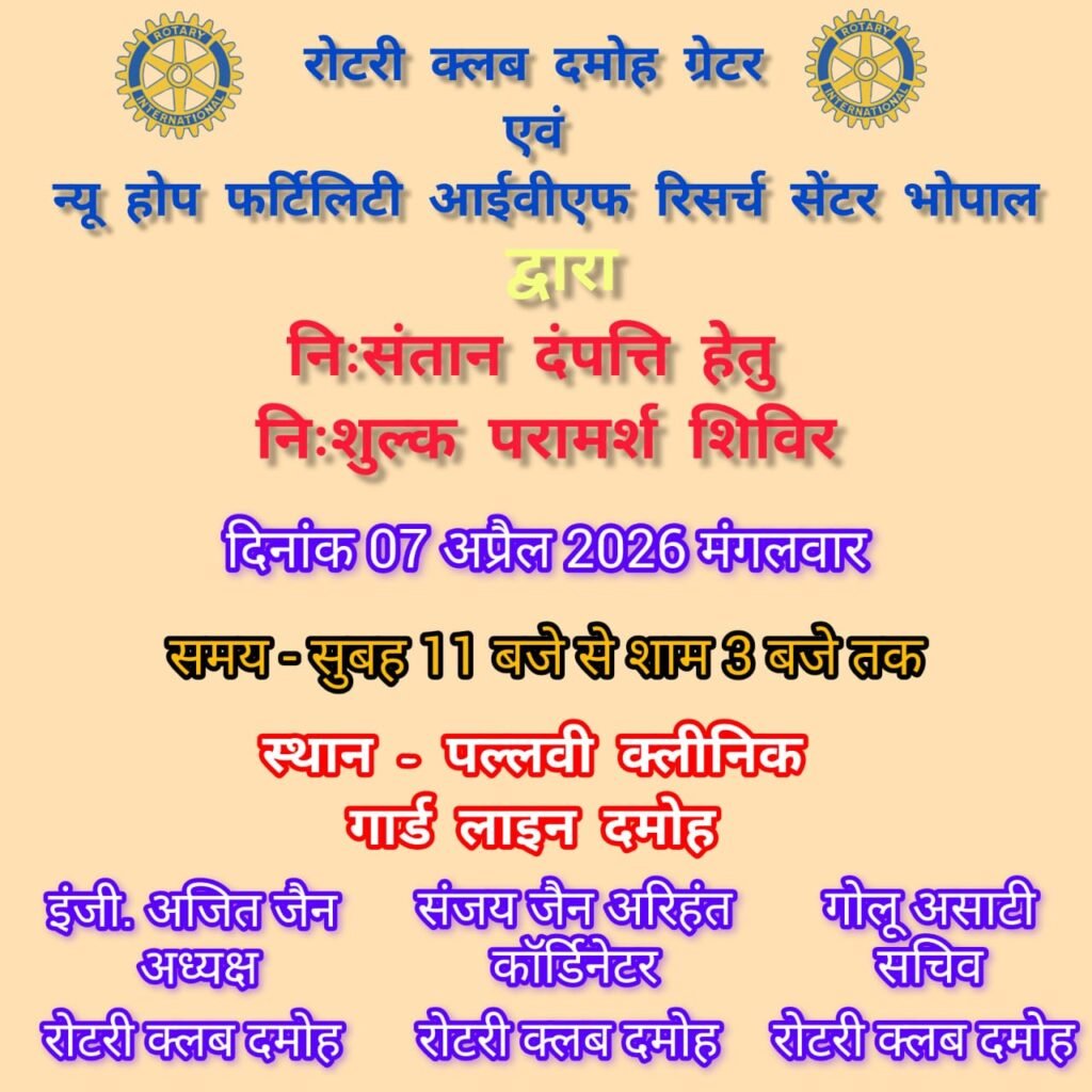 दमोह। रोटरी क्लब दमोह ग्रेटर न्यू होप फर्टिलिटी आईवीएफ रिसर्च सेंटर भोपाल के संयुक्त तत्वाधान में निःसंतान दंपत्ति हेतु निःशुल्क परामर्श शिविर का आयोजन सुबह 11 बजे से शाम 3 बजे तक पल्लवी क्लीनिक गार्ड लाइन में किया जाएगा। इस निःशुल्क में विशेषज्ञ डॉक्टरों द्वारा निःसंतान दंपतियों के लिए परामर्श दिया जाएगा। रोटरी क्लब दमोह द्वारा दमोह जिले के समस्त निःसंतान दंपतियों से अपील की है कि वे अधिक से अधिक संख्या में इस शिविर में शामिल होकर निःशुल्क परामर्श का लाभ उठाएं।