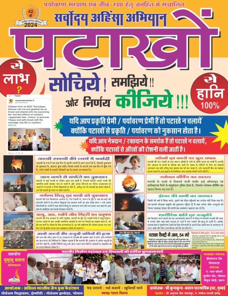 सर्वोदय अहिंसा अभियान के राष्ट्रीय संयोजक संजय शास्त्री का कहना हैं कि सकल जैन समाज द्वारा संचालित विविध पाठशालाओं एवं युवाओं तक सर्वोदय अहिंसा अभियान पहुंचाने के लिए प्रतिवर्ष अनुसार इस वर्ष भी हमने 50 हजार पोस्टर प्रकाशित कराए हैं जो पटाखों से लाभ जीरो प्रतिशत एवं हानि सौ प्रतिशत बताकर जीव रक्षा एवं पर्यावरण संरक्षण के साथ स्वच्छ भारत मिशन का संदेश देता है।