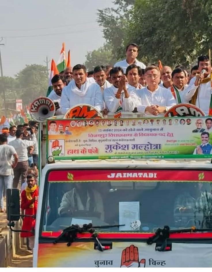 विजयपुर । प्रदेश कांग्रेस अध्यक्ष श्री जीतू पटवारी आज प्रदेश के श्योपुर जिले के विजयपुर विधानसभा में हो रहे उपचुनाव के तहत कांग्रेस प्रत्याषी मुकेष मल्होत्रा की नामांकन रैली में शामिल हुये। इस दौरान पूर्व मुख्यमंत्री दिग्विजय सिंह सहित वरिष्ठ कांग्रेस नेतागण राज्यसभा सांसदद्वय विवेक तन्खा और अषोक सिंह, पूर्व मंत्री जयवर्धन सिंह, विधायक सचिन यादव भी श्री पटवारी के साथ विजयपुर पहुंचे।