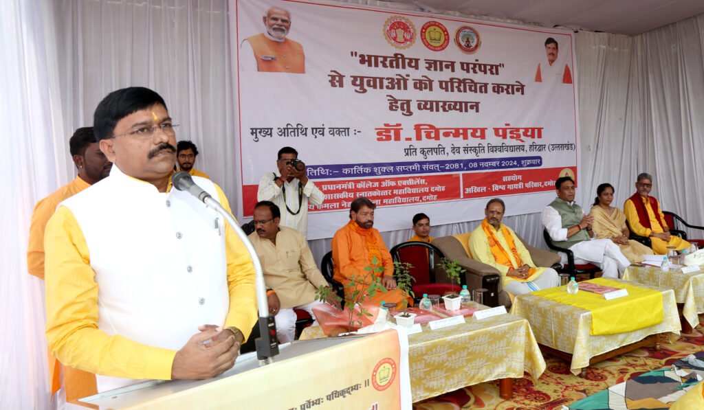 उन्होंने कहा निश्चित रूप से भारतीय ज्ञान परंपरा एक उच्च परंपरा हैं, एक समय में देश विश्व गुरु हुआ करता था, विश्व गुरु की बात भारतीय ज्ञान परंपरा के आधार पर ही होती हैं, आज के विद्यार्थियों के अंदर पश्चिम की अनुकरणीय की मनोवृत्ति दिखाई देती हैं, हमारी परंपराएं बड़ी उज्जवल रही हैं। पूर्वजों ने कला, कौशल जीवन के प्रत्येक क्षेत्र में अपना योगदान देने का काम किया हैं, यह इतिहास आज के युवाओं को बताने की आवश्यकता है। राज्य पिछड़ा वर्ग आयोग के अध्यक्ष डाँ रामकृष्ण कुसमरिया ने कहा यह इलाका अब अमन, चैन, सुख-शांति के साथ विकास का काम कर रहा हैं। गुरुदेव का ऐसा आशीर्वाद रहा लगातार मुझे यहां की जनता ने आशीर्वाद दिया और सांसद-विधायक बनाकर देश की सेवा करने का अवसर प्रदान किया। उन्होंने कहा चिन्मय पंड्या जी का आगमन इसी तरह होता रहे। दमोह की पवित्र धरती बहुत भाग्यशाली हैं कि ऐसे ऐसे महापुरुषों को आकर्षित करके यहां लाती हैं। कार्यक्रम के प्रारंभ में प्राचार्य डॉ.पीके जैन एवं प्राचार्य पीएल जैन और महाविद्यालय के प्रोफेसर्स ने अतिथियों का स्वागत शाल-श्रीफल से किया। कार्यक्रम के अंत में जिला प्रशासन की ओर से वीरांगना रानी दुर्गावती जी की प्रतिमा स्मृति चिन्ह के रूप में भेंट की गई। कृष्णा पटैल ने जागेश्वर महादेव का चित्र भेंट किया। आभार प्रदर्शन डॉ विक्रांत सिंह चौहान ने किया।