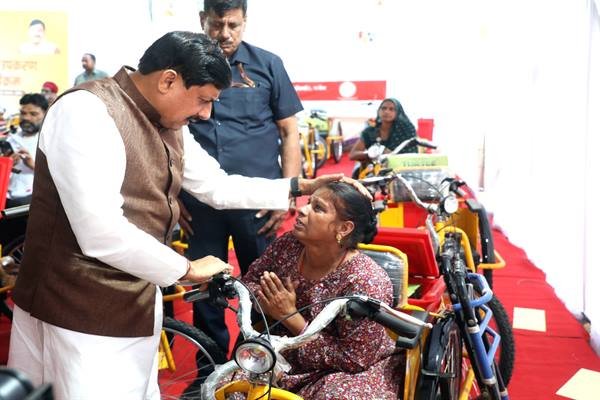मुख्यमंत्री डॉ. यादव ने शनिवार को इंदौर के ग्रामीण हाट बाजार में आयोजित कार्यक्रम में इंदौर के 470 दिव्यांगजनों को लेपटॉप, मोट्रेट ट्राईसिकल सहित अन्य सहायक उपकरण वितरित किये। दिव्यांगजनों को समाज की मुख्य धारा से जोडने के लिए उन्हें आत्म-सम्मान से जीवन-यापन करने के लिए राज्य सरकार के सामाजिक न्याय एवं दिव्यांगजन सशक्तिकरण विभाग, भारत सरकार की एडिप योजना तथा अवंतिका गैस एजेन्सी के सीएसआर के साथ भारतीय रेडक्रास सोसायटी के सहयोग से इंदौर जिले के 155 दिव्यांगजनों को मोट्रेट ट्राईसाइकल, निःशक्त शिक्षा प्रोत्साहन योजना के अंतर्गत 81 छात्र/छात्राओं को लैपटॉप, 6 दम्पतियों को मुख्यमंत्री निःशक्त विवाह प्रोत्साहन योजना के अंतर्गत आर्थिक सहायता, 130 दिव्यांग वृद्धजनों को डिजीटल श्रवणयंत्र, 99 दिव्यांगजनों को व्हील चेयर, सी.पी.वेयर, बैशाखी और कैलीपर्स दिये गये। जिले के कुल 470 दिव्यांगजनों को 1 करोड़ 33 लाख रूपये की सामग्री का वितरण किया गया। इसके अलावा कलेक्टर आशीष सिंह की पहल पर दिव्यांगजनों को निजी क्षेत्रों में रोजगार के अवसर उपलब्ध कराने की दृष्टि से प्रारंभ किये गए सशक्त दिव्यांग रोजगार पोर्टल के माध्यम से चयनित पाँच दिव्यांगजनों को नियुक्ति-पत्र भी सौंपे गये। आरंभ में मुख्यमंत्री डॉ. यादव द्वारा दिव्यांगजनों का पुष्पवर्षा कर स्वागत किया गया। अतिथियों ने दीप प्रज्ज्वलित कर कार्यक्रम का शुभारंभ किया।