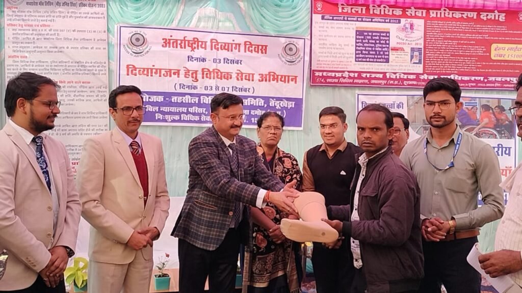 दमोह : म.प्र.राज्य विधिक सेवा प्राधिकरण, जबलपुर द्वारा दिये गये निर्देशों के तहत, प्रधान जिला न्यायाधीश एवं जिला विधिक सेवा प्राधिकरण अध्यक्ष आनंद कुमार तिवारी की उपस्थिति में अंतर्राष्ट्रीय दिव्यांग दिवस के अवसर पर विधिक सेवा अभियान (03 से 07 दिसम्बर) अंतर्गत दिव्यांगजन विशेषकर दिव्यांग विद्यालयीन छात्र/छात्राओं के सर्वांगीण विकास के उद्देश्य से जिला प्रशासन, शिक्षा विभाग, सामाजिक न्याय, स्थानीय निकाय के सहयोग एवं समन्वय से ग्राम हर्रई सिंगोरगढ़ में वृहद विधिक साक्षरता एवं स्वास्थ्य परीक्षण शिविर आयोजित किया गया। इस मौके पर जिला न्यायाधीश/सचिव जिला विधिक सेवा प्राधिकरण धर्मेश भट्ट, न्यायिक मजिस्ट्रेट प्रथम श्रेणी तेंदूखेड़ा पुजित कमल, अतिरिक्त जिला दण्डाधिकारी मीना मसराम, एस.डी.एम. सौरभ गंदर्भ, एस.डी.ओ.पी. देवी सिंह ठाकुर, जिला विधिक सहायता अधिकारी रजनीश चौरसिया मौजूद थे।