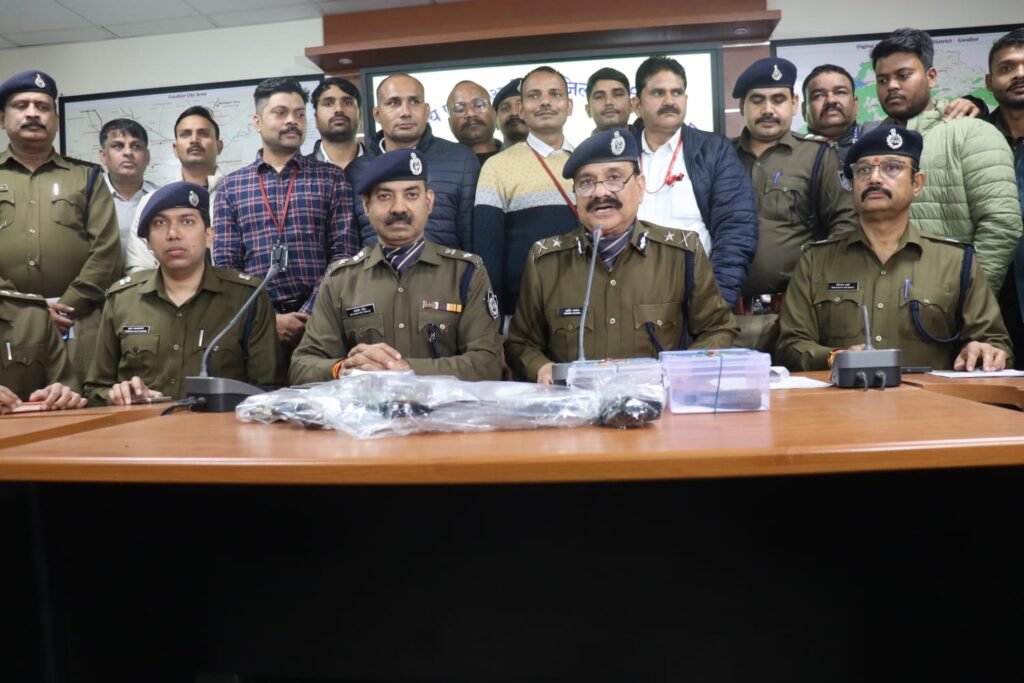 फरियादी मनोहर कुमार हवलानी पुत्र लक्ष्मण दास हवलानी उम्र 50 साल निवासी ठाकुर बाबा रोड शांति गार्डन के पास डबरा जिला ग्वालियर ने थाना डबरा सिटी में रिपोर्ट दर्ज कराई थी कि दिनाक 23.12.2024 को शाम करीवन 04.15 बजे वह अपने ऑफिस में बैठा हुआ था तभी मेरे ऑफिस के अन्दर चार अज्ञात व्यक्ति मुंह बाधे हुये आये चारांे लोगों के पास कट्टे बंदूक थे, उन चारांे में से एक व्यक्ति ने मेरे ऊपर कट्टा तानते हुये दराज में रखे हुए कुल 14,50,000/- रुपये निकाल लिये। बदमाशों ने मेरा फोन व पर्स छुड़ाकर मुझे बाथरूम में बन्द कर दिया था कुछ देर बाद बाथरुम के रोशनदान से मैने आसपास के लोगों को आवाज लगाई और किसी ने बाथरूम का दरवाजा खोला तब मैं बाहर निकला। फरियादी की रिपोर्ट पर से थाना डबरा सिटी में अज्ञात आरोपियों के खिलाफ अप0क्र0 835/24 धारा 311 बीएनएस एवं 11/13 एमपीडीपीके एक्ट का पंजीबद्ध कर विवेचना में लिया गया। उक्त घटना को गंभीरता से लेते हुए पुलिस महानिरीक्षक ग्वालियर जोन श्री अरविन्द कुमार सक्सेना(भापुसे) द्वारा प्रकरण में वांछित अज्ञात आरोपियों की पतारसी पर 30 हजार रूपये का इनाम घोषित किया गया था।
