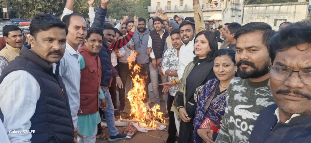 दमोह – कांग्रेस के राष्ट्रीय अध्यक्ष मल्लिका अर्जुन खड़गे द्वारा सनातन संस्कृति और प्रयागराज कुंभ जैसे पवित्र आयोजन पर दिए गए बयान से आक्रोशित होकर भारतीय जनता युवा मोर्चा दमोह द्वारा भाजपा जिला अध्यक्ष श्याम शिवहरे के निर्देशन एवं युवा मोर्चा जिला अध्यक्ष प्रिंस जैन के मार्गदर्शन में नगर मंडल अध्यक्ष राजुल चौराहा के नेतृत्व मे कांग्रेस के राष्ट्रीय अध्यक्ष मल्लिका अर्जुन खड़गे का पुतला दहन किया गया इस अवसर भारतीय जनता पार्टी दमोह के पूर्व ज़िलाध्यक्ष प्रीतम सिंह ने कहा कि खड़गे जी द्वारा सनातन संस्कृति एवं हम सभी की आस्था के केंद्र प्रयागराज महाकुंभ जैसे पवित्र आयोजन पर जो बात कही गई है वह निंदनीय है प्रयागराज महाकुंभ हम सभी की आस्था का प्रतीक है और सनातन संस्कृति के पवित्र आयोजन पर खड़गे जैसे वरिष्ठ नेता के द्वारा दिया गया बयान शोभा नहीं देता इससे सम्पूर्ण भारत वर्ष के हिंदू समुदाय को गहरा आघात पहुँचा हैं