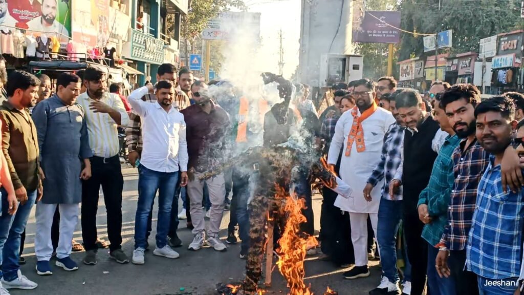 छिंदवाड़ा । प्रदेश संगठन व सांसद श्री विवेक बंटी साहू के निर्देश पर कांग्रेस के राष्ट्रीय अध्यक्ष मल्लिकार्जुन खड़गे का भाजपा नगर युवा मोर्चा द्वारा पुतला दहन किया गया भाजपा नगर युवा मोर्चा अध्य्क्ष बिट्टू मण्डरहा व अनुज मल्होत्रा ने बताया कि सनातन संस्कृति से करोड़ों हिन्दुओं की आस्था के प्रतीक “महाकुम्भ” के संदर्भ में की गईं अनर्गल टिप्पणी करना उनकी मानसिक स्थिति सही नहीं होना मंदबुद्धि का परिचय देता है कांग्रेस हमेशा से ही सनातन विरोधी रही है उनके नेता समय-समय पर सनातन धर्म के विरोध में बयानबाजी करते रहते हैं और हिंदुओं की आस्था से खिलवाड़ करते हैं बाबा साहब अंबेडकर द्वारा रचित संविधान के अनुच्छेद 25 में सभी व्यक्तियों को अंतःकरण की स्वतंत्रता, धर्म को अबाध रूप से मानने, आचरण करने और प्रचार करने का सामान अधिकार होगा। यह अधिकार नागरिकों एवं गैर-नागरिकों के लिये भी उपलब्ध है। अवसर पर मुख्य रूप से नगर मंडल अध्यक्ष सौरभ ठाकुर, अंकुर शुक्ला, रोहित पोफली, नवीन बारस्कर, लीला बजोलिया, पंकज पाटनी, पार्षद जगदीश गोदरे, पप्पू ठाकुर, नीरज भारद्वाज, रवि मालवी, नितिन मरकाम, अंकित तिवारी, रोहित माहोरे, शिवा सरसवार, लकी पाल, मयूर पटेल, विश्वेन्द्र बैस, अंकित ढोंक, संदीप मालवी, आनंद गोहर, कुणाल पाल, शुभम साहू, नितिन राउत, सोमेंद्र ठाकुर, पीयूष खुराना, भूपेंद्र बेदी, अविनाश शर्मा, आकाश ठाकुर, शिवम साहू, विकास वर्मा, दिलीप वर्मा, दिव्यांशु लोखंडे, मोहित बुनकर, ऋषभ ताम्रकार, ममता डोंगरे, शैलेश गडवाल, संकेत पांडे सहित बड़ी संख्या में भाजपा पदाधिकारी एवं कार्यकर्तागण उपस्थित रहे ।